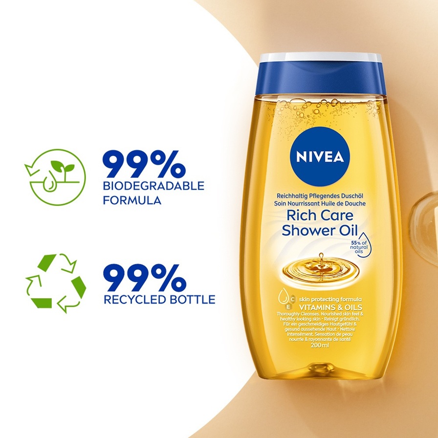NIVEA Shower Oil on ravitseva ylellisen tuoksuinen suihkyöljy, joka jättää ihosi pehmeän ja sileän tuntuiseksi.