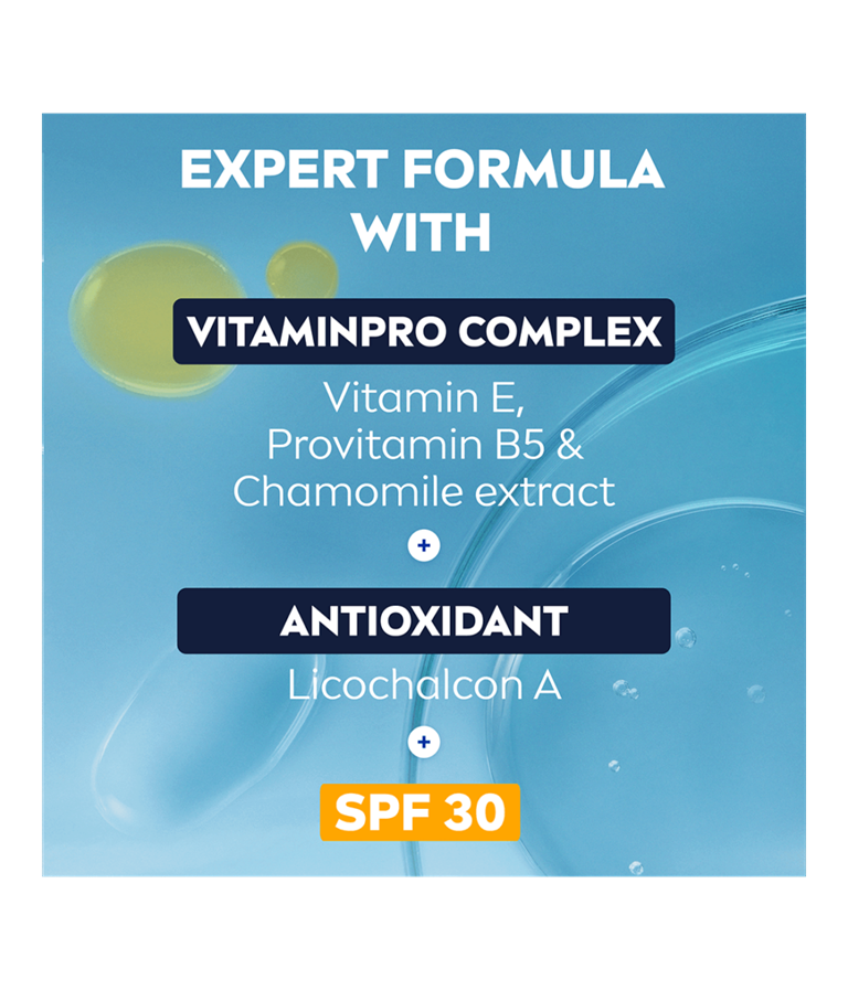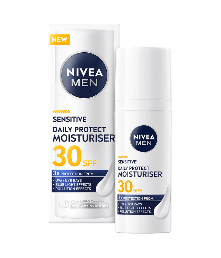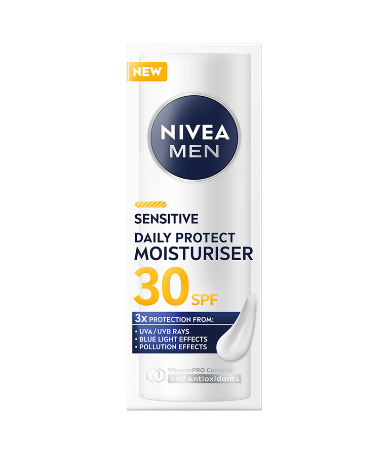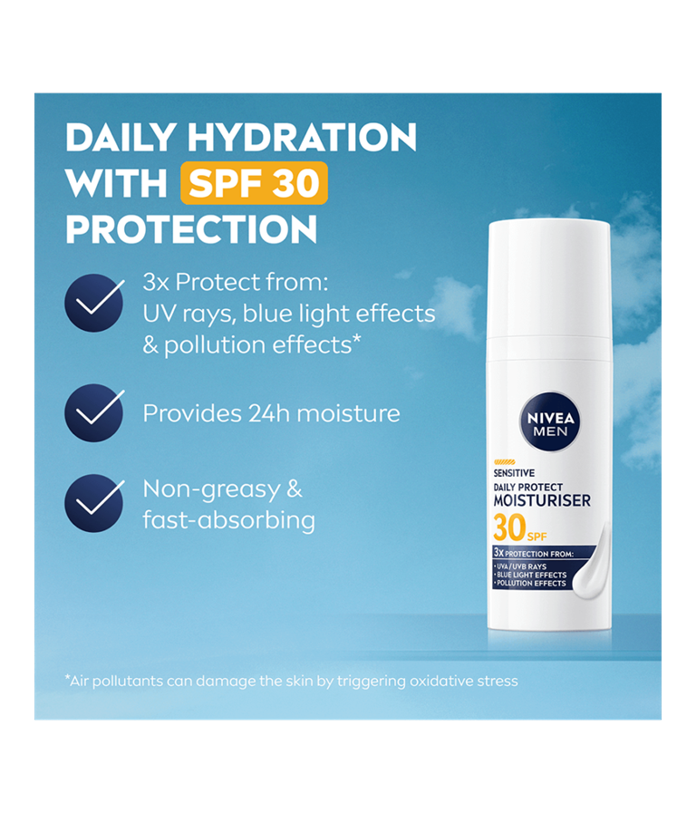 NIVEA MEN Sensitive Daily Protect Moisturiser SK 30 -kasvovoiteen kevyt, kosteuttava koostumus sisältää VitaminPRO-yhdisteen, suojakertoimen 30 ja antioksidantteja. 3x suoja UVA/UVB-säteilyltä, sinivalon vaikutuksilta ja ilmansaasteilta.