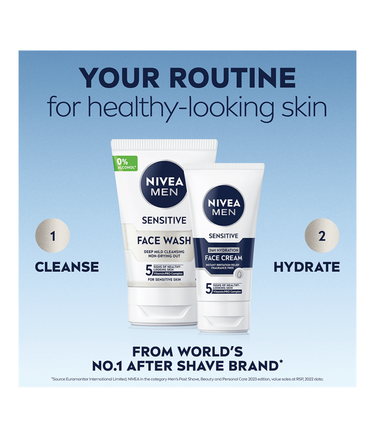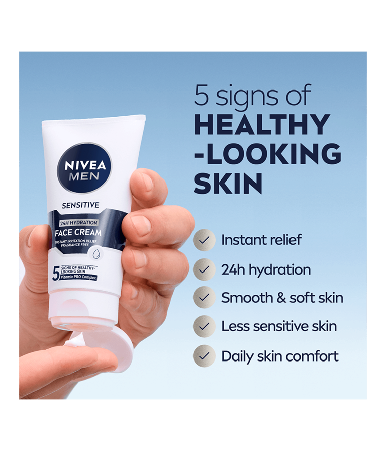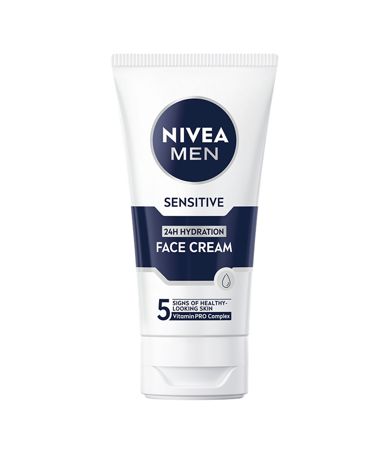 Erityisesti herkälle iholle kehitetty NIVEA MEN Sensitive Face Cream -kasvovoide kosteuttaa ihoa tehokkaasti.