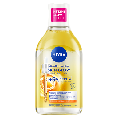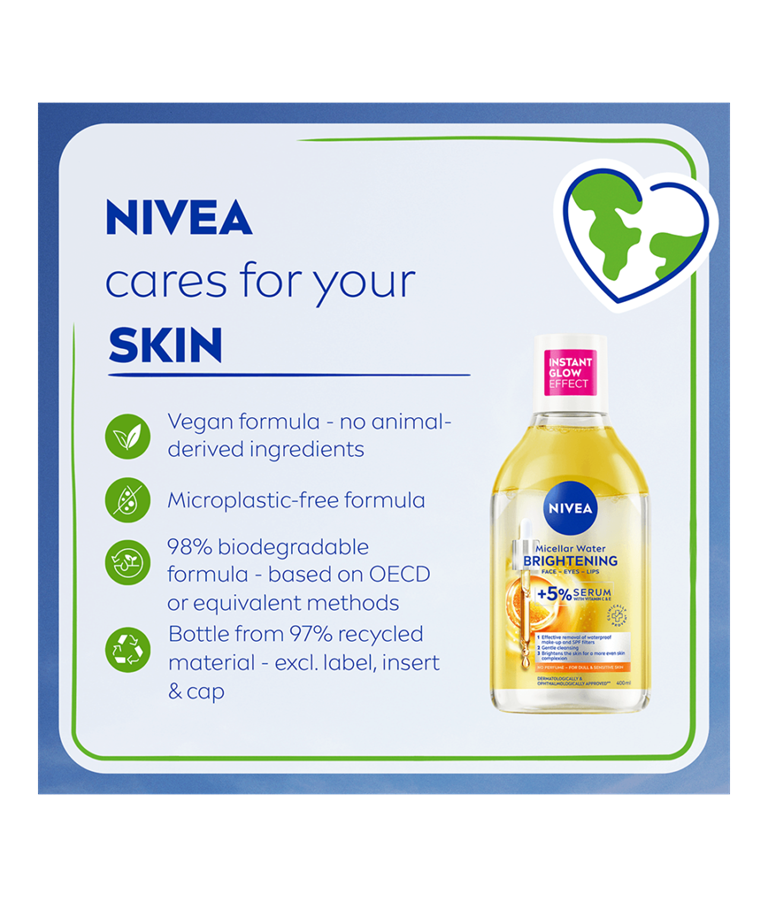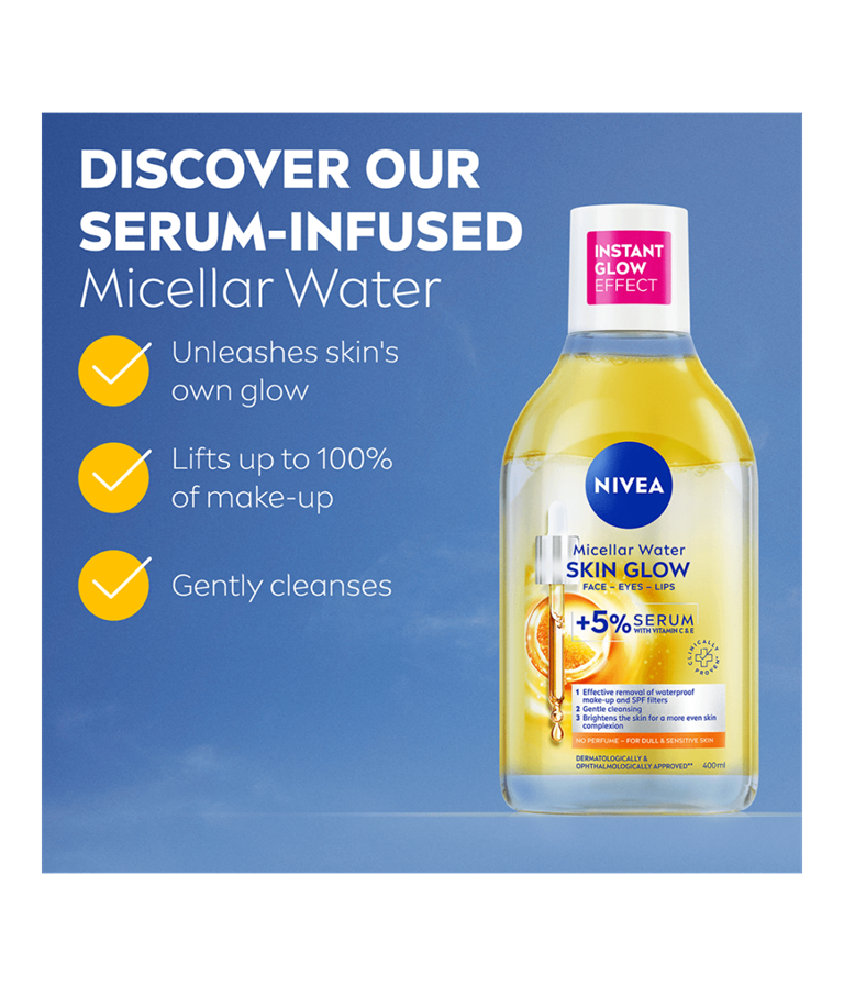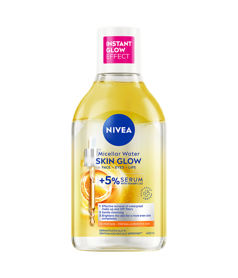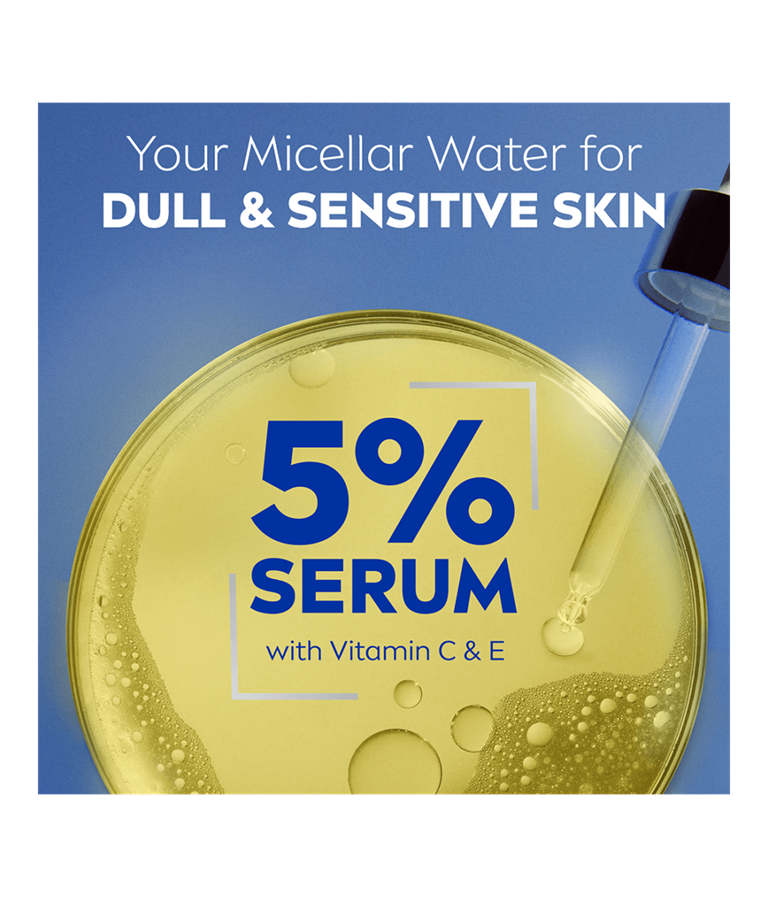 Esittelyssä NIVEA Kirkastava seerumia sisältävä misellivesi, jossa on 5 % seerumitehoa ja joka on rikastettu C- ja E-vitamiinilla – kirkastaa ja kosteuttaa ihoa. Tämä koostumus poistaa tehokkaasti jopa 100 % vedenkestävästä meikistä ja lisää samalla ihosi luonnollista hehkua.
