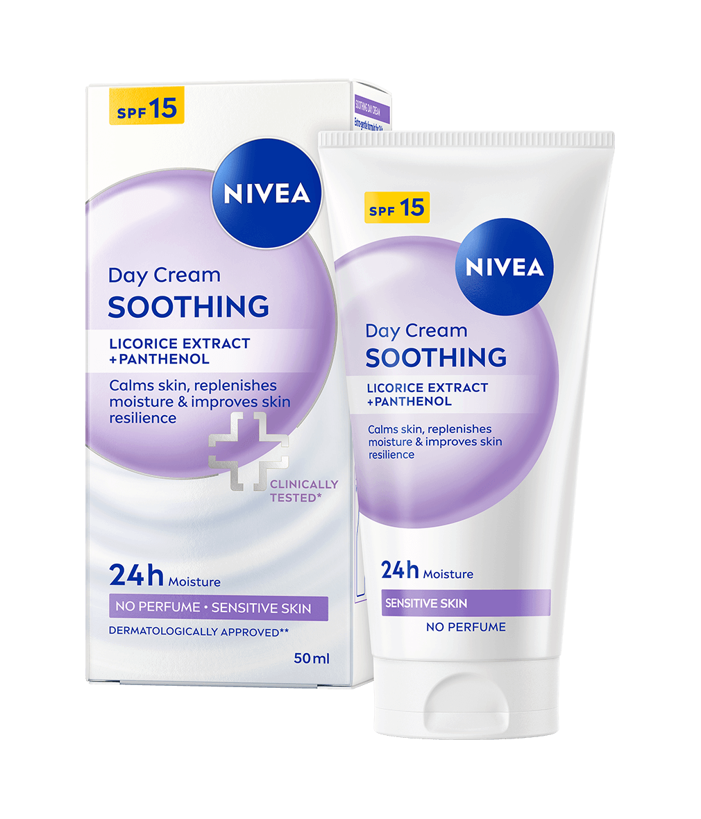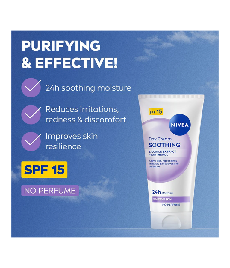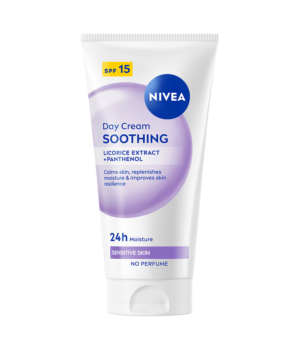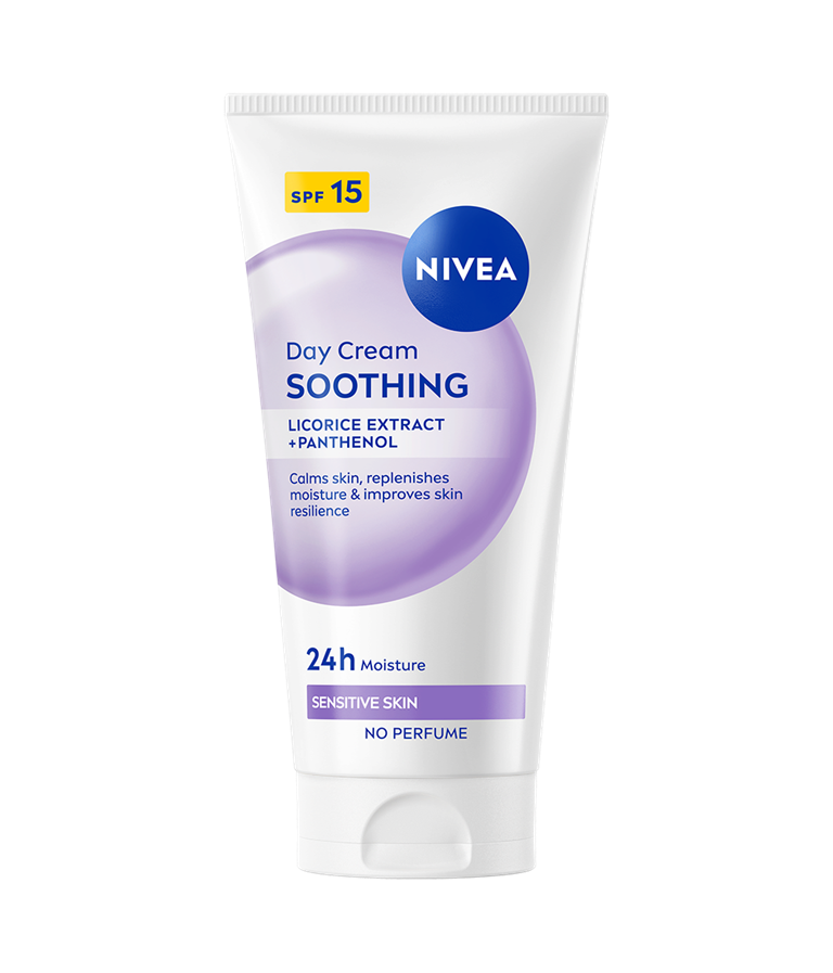 NIVEA Soothing Day Cream SK 15 - päivävoiteen hajusteeton koostumus kosteuttaa ja rauhoittaa herkkää ihoa. Lievittää ihoärsytystä, punoitusta, kuivuutta ja kiristävää tunnetta.