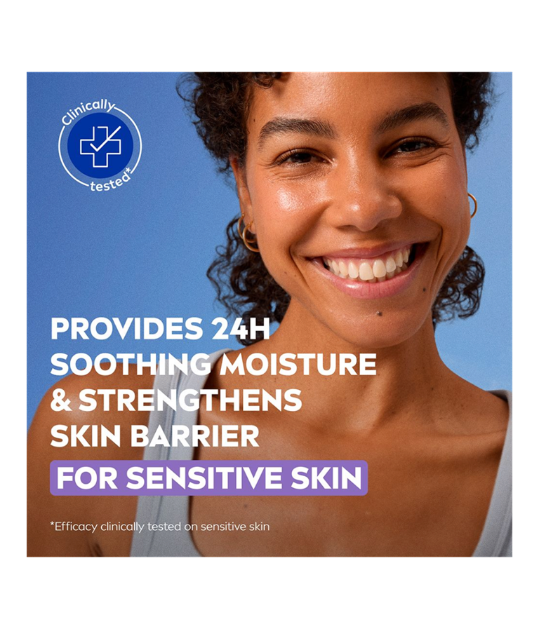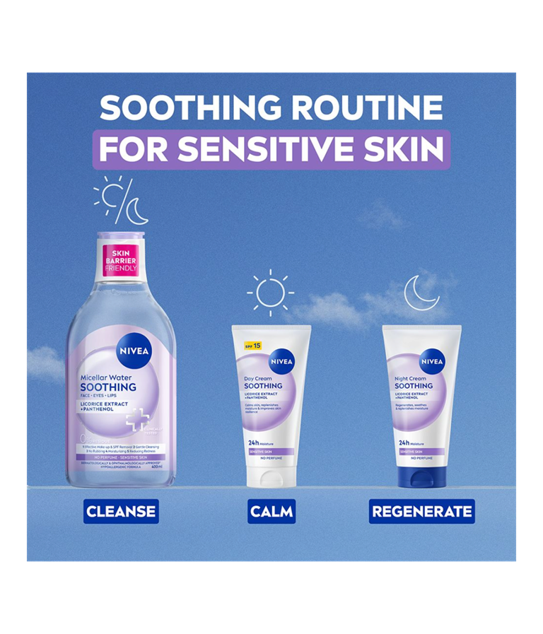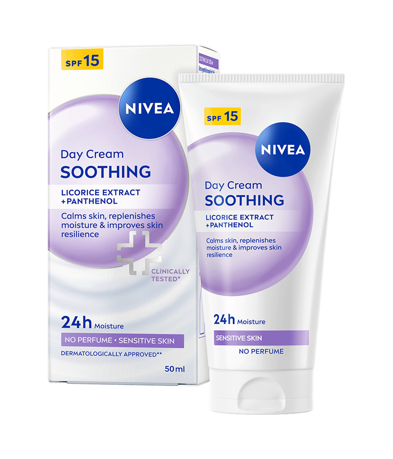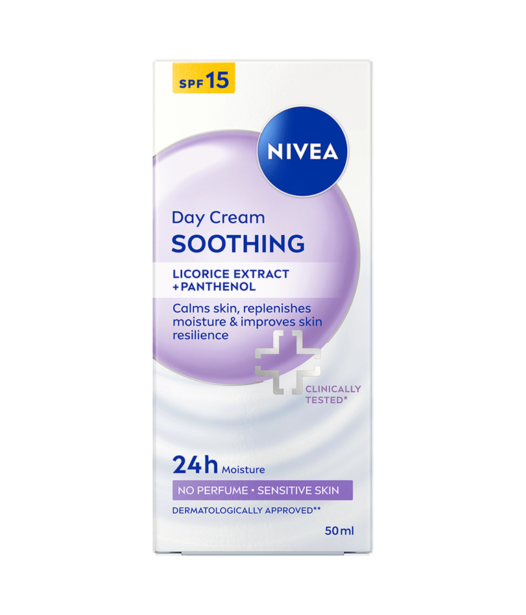 NIVEA Soothing Day Cream SK 15 - päivävoiteen hajusteeton koostumus kosteuttaa ja rauhoittaa herkkää ihoa. Lievittää ihoärsytystä, punoitusta, kuivuutta ja kiristävää tunnetta.
