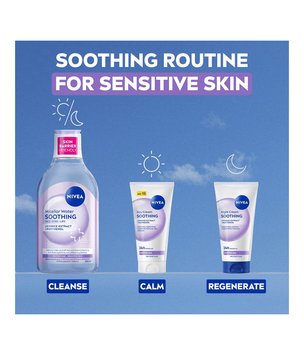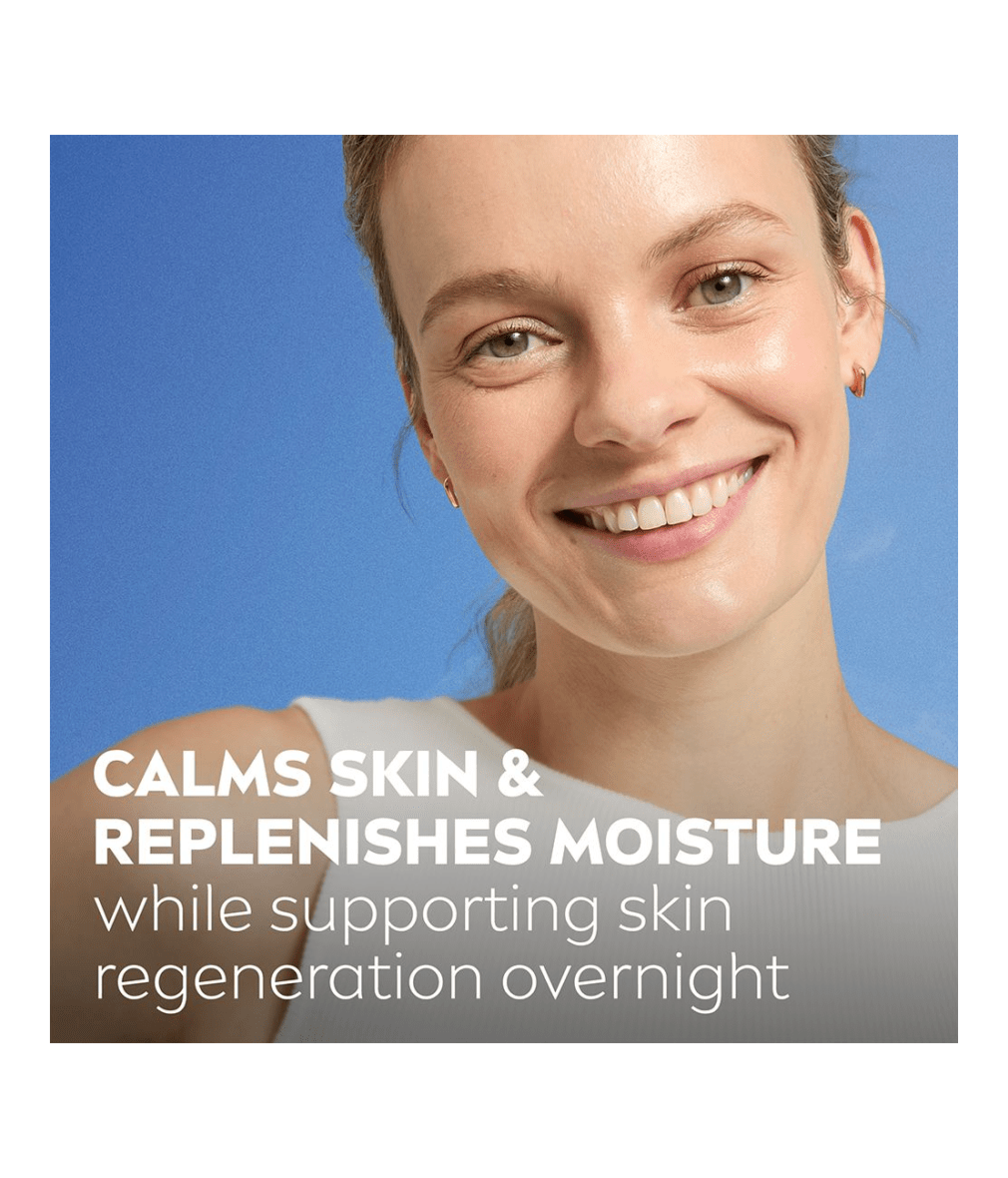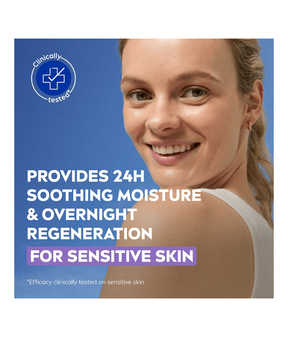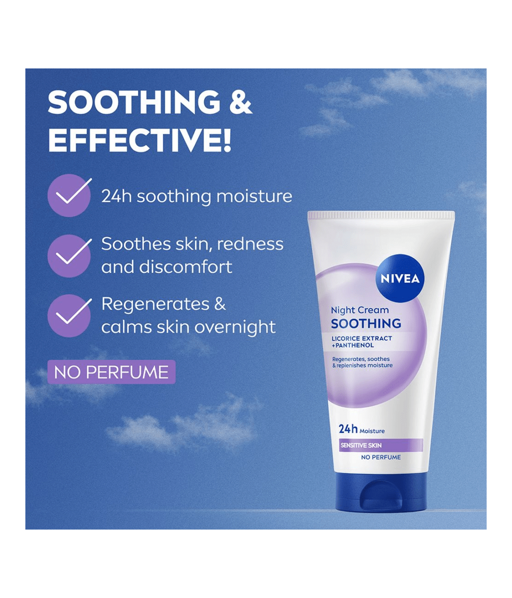 NIVEA Soothing Night Cream -yövoiteen hajusteeton koostumus lievittää herkän ihon ärsytystä, samalla kosteuttaen ja uudistaen ihoa tehokkaasti yön aikana.