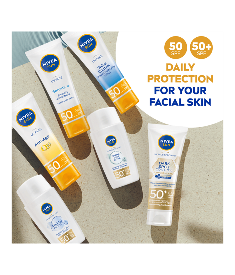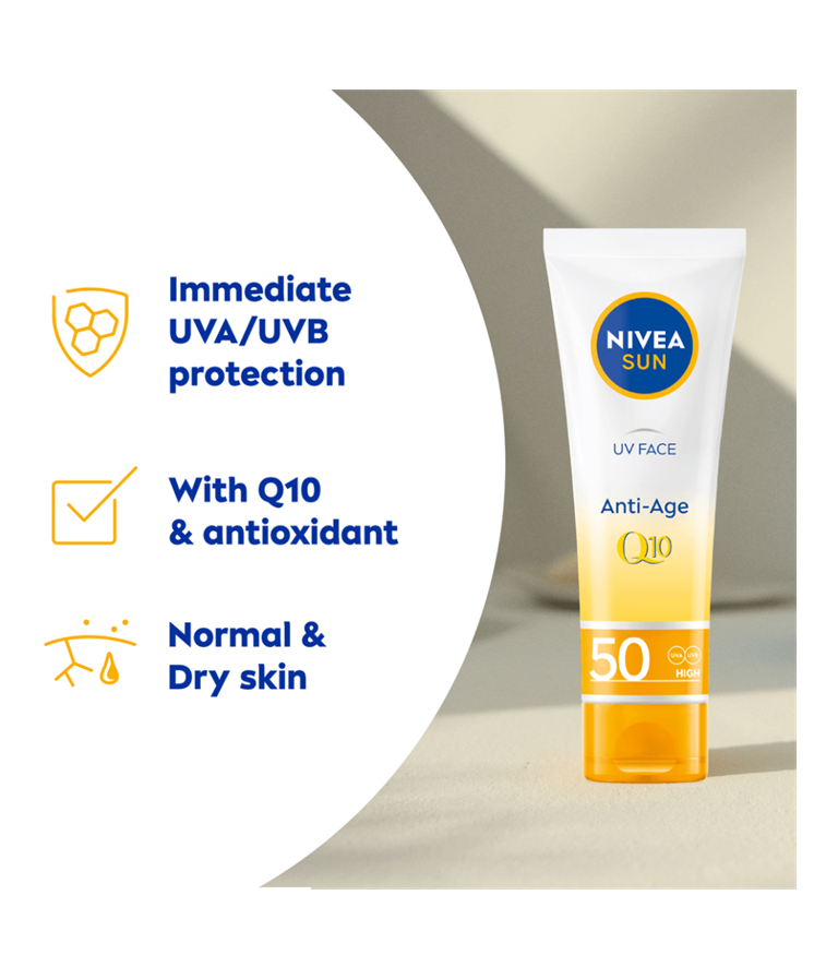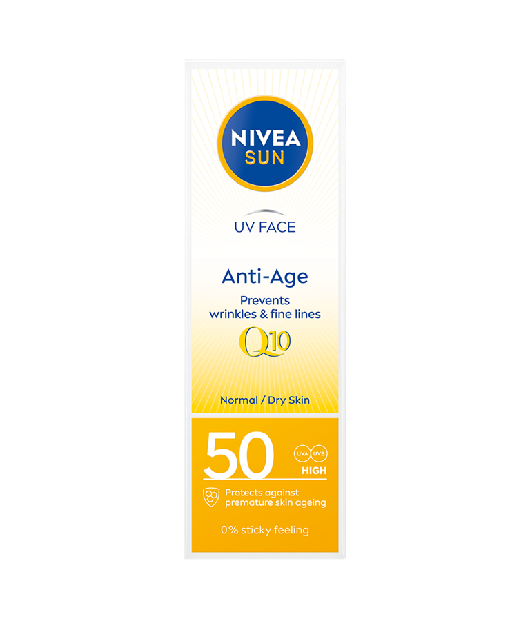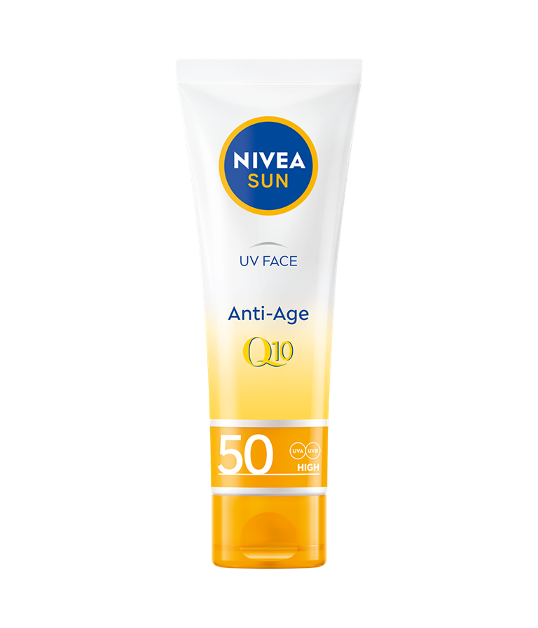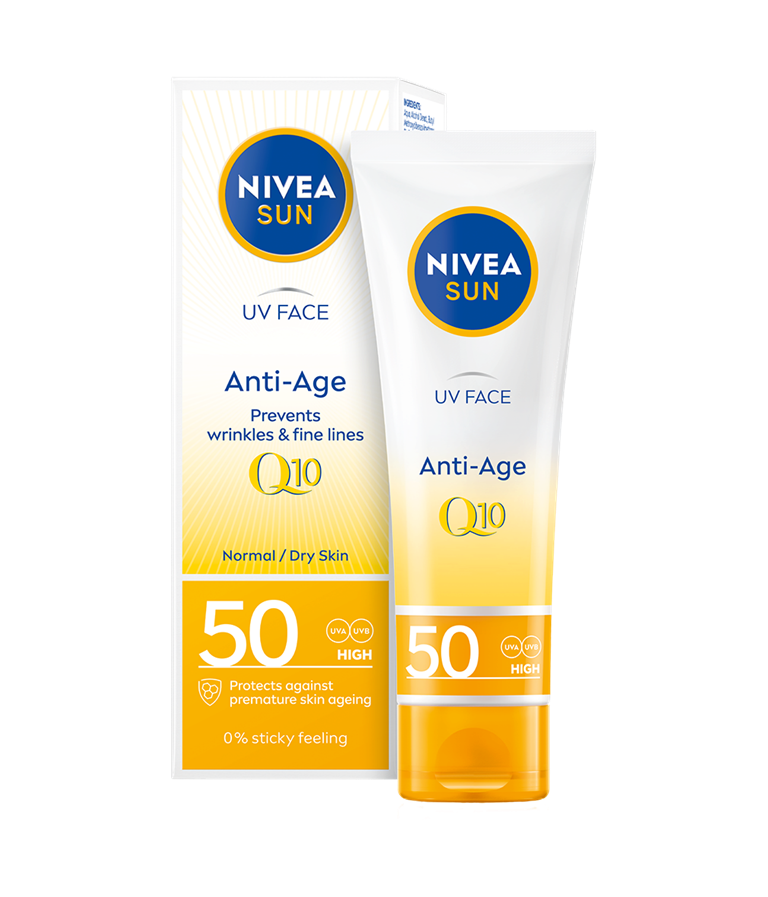 NIVEA SUN UV Face Anti-Age Q10 SK50 -aurinkovoiteen sisältämät antioksidantit estävät auringon aiheuttamaa ennenaikaista ihon vanhenemista.