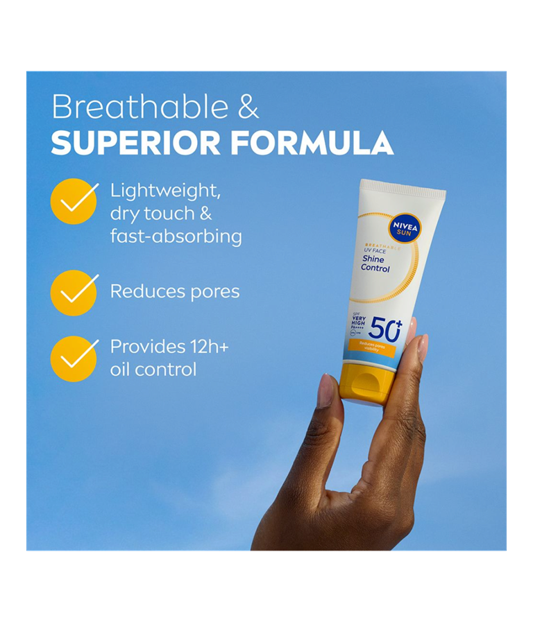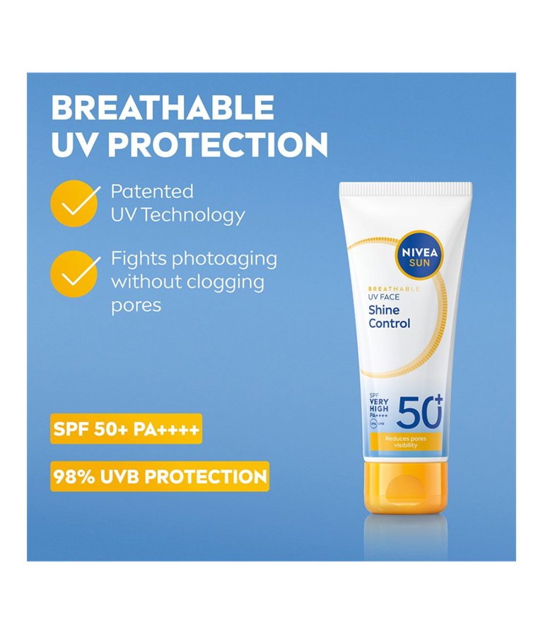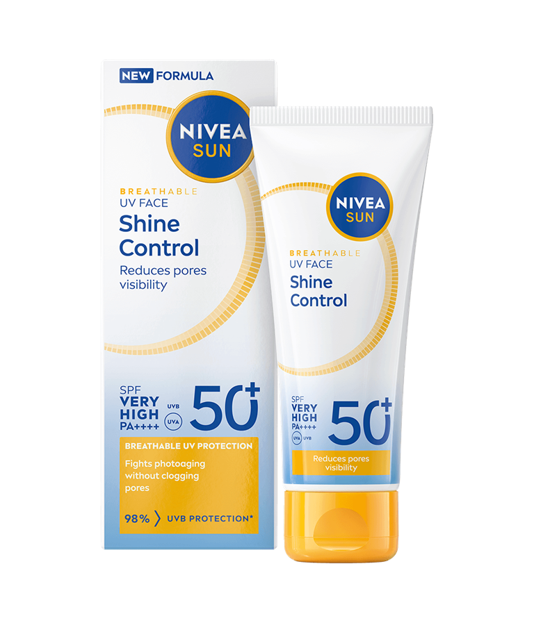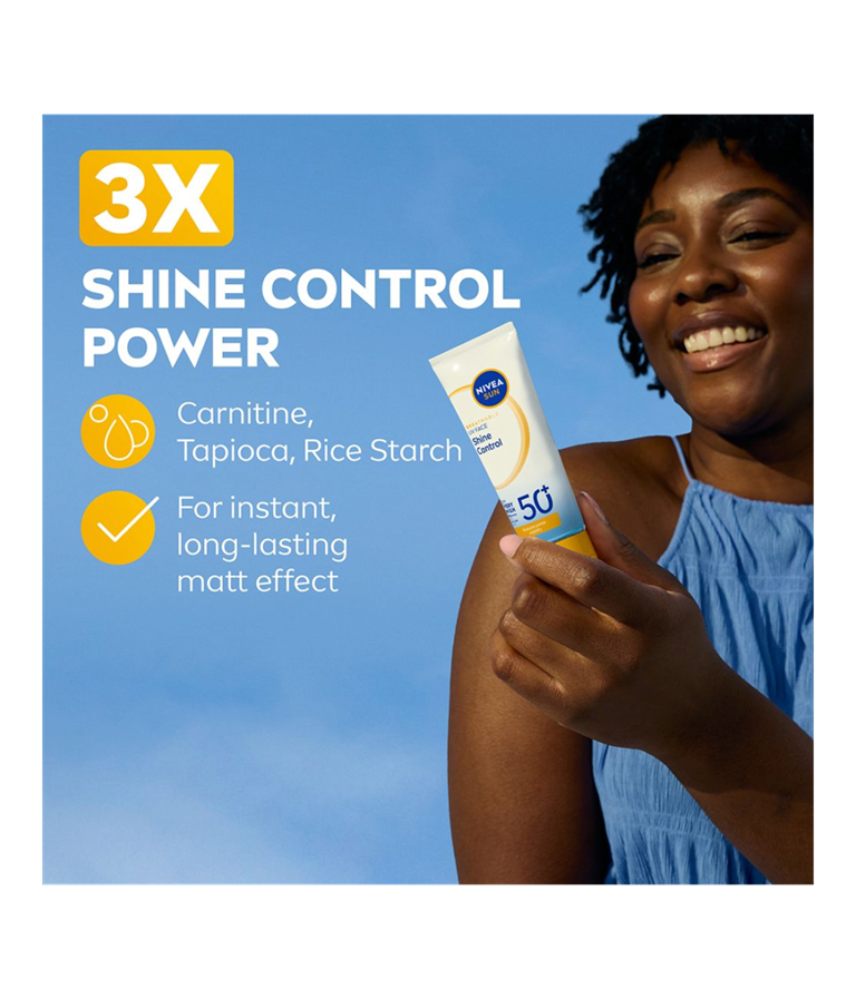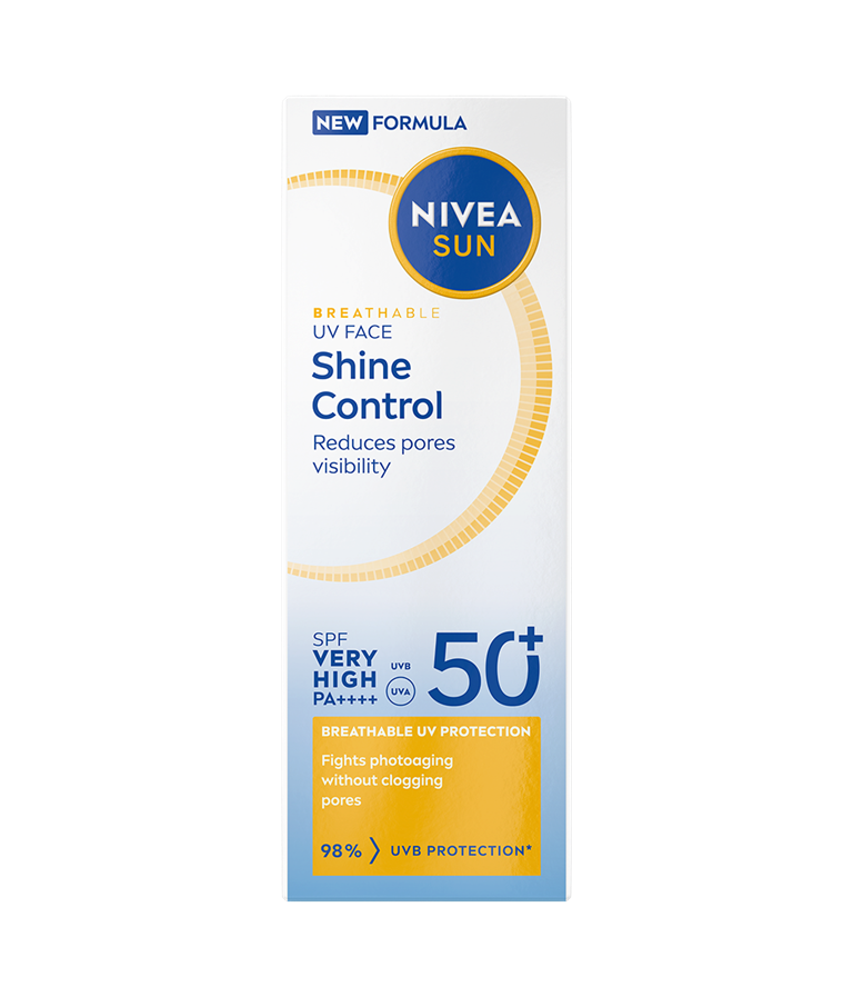 NIVEA SUN UV Face Shine Control Sun Cream SK 50+ -aurinkosuojavoide antaa iholle tehokkaan suojan tukkimatta ihohuokosia. Hillitsee ihon öljyisyyttä yli 12 tuntia ja vähentää ihohuokosten näkyvyyttä.