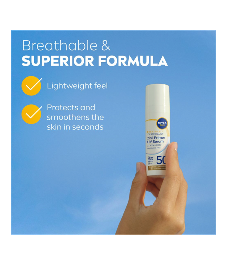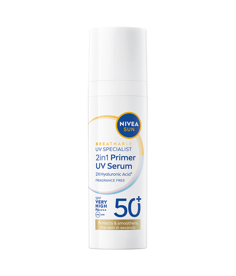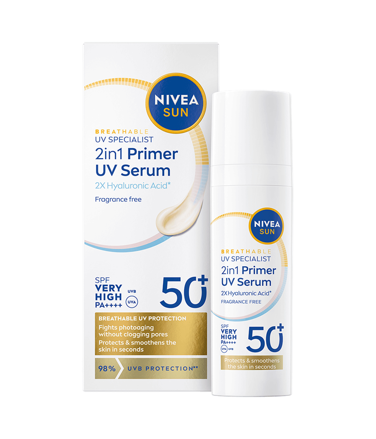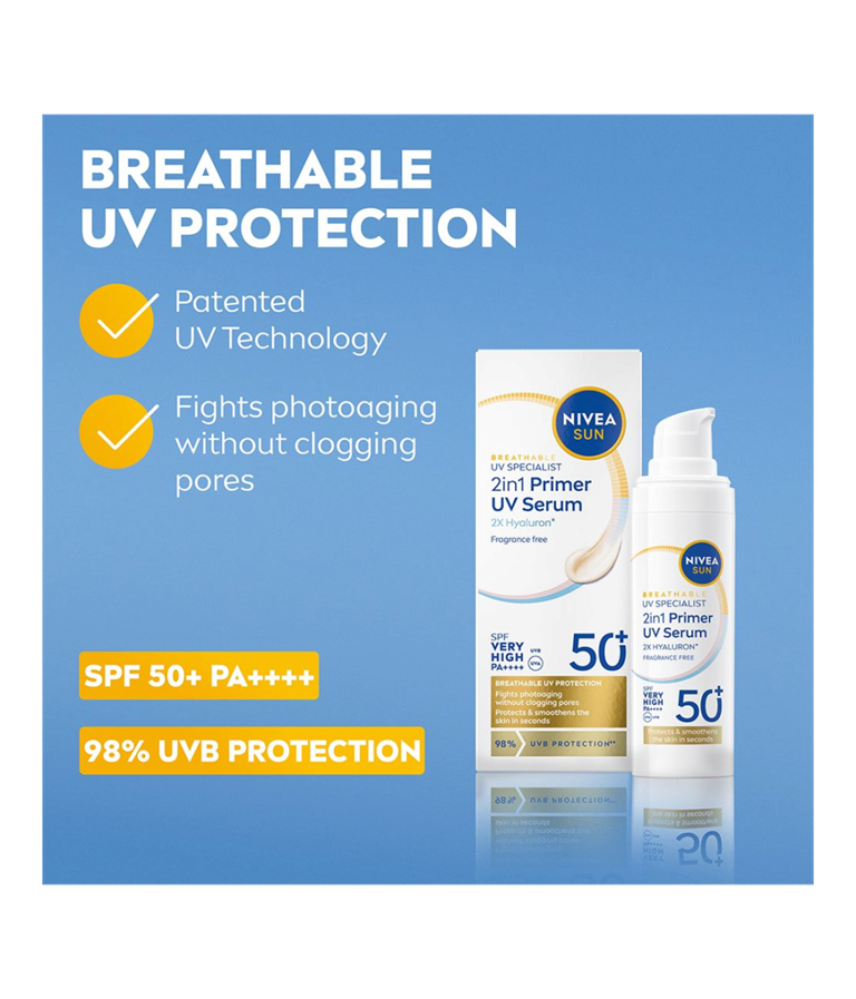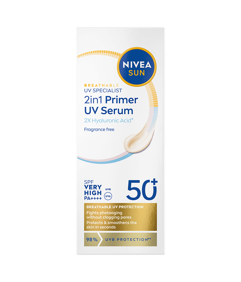 NIVEA SUN UV Specialist 2in1 Primer Daily UV Serum SK50+ -aurinkosuojaseerumi suojaa ja silottaa ihoa, parantaen meikin kestävyyttä.