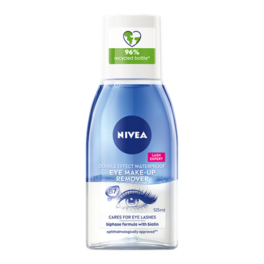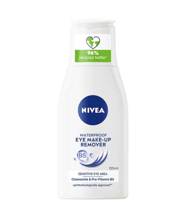 Hellävarainen NIVEA Waterproof Eye Make-Up Remover -silmämeikinpuhdistusaine poistaa tehokkaasti vedenkestävän silmämeikin.